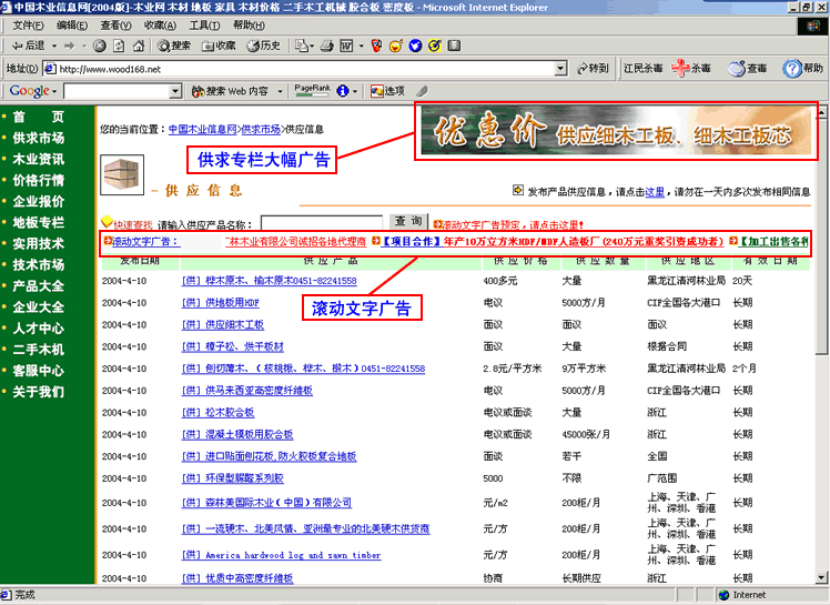 價(jià)格說明:供求專欄大幅廣告:尺寸480×60象素 1000元/月; 滾動(dòng)文字廣告:300元/月/條